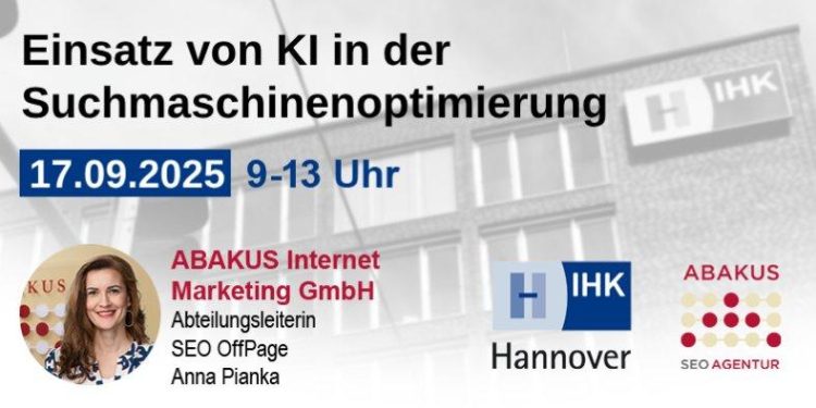 Die Industrie- und Handelskammer (IHK) Hannover lädt am 17. September 2025 von 9 bis 13 Uhr zu einem praxisorientierten Seminar rund um den Einsatz von Künstlicher Intelligenz (KI) in der Suchmaschinenoptimierung (SEO) ein. Als Referentin gibt Anna Pianka, Teamleiterin SEO OffPage bei ABAKUS Internet Marketing, wertvolle Einblicke aus der beruflichen Praxis. Im Zentrum des halbtägigen…Continue reading IHK Hannover Seminar „Einsatz von KI in der Suchmaschinenoptimierung“ am 17.09.2025 von 9-13 Uhr (Seminar | Hannover)