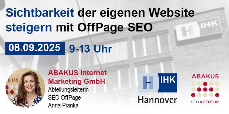 Die Industrie- und Handelskammer (IHK) Hannover lädt am 8. September 2025 von 9 bis 13 Uhr zu einem praxisorientierten Seminar zum Thema OffPage-Suchmaschinenoptimierung (OffPage SEO) ein. Ziel der Veranstaltung ist es, Websitebetreibern, Marketingverantwortlichen und digitalen Strategen effektive Wege aufzuzeigen, wie sie die Sichtbarkeit ihrer Website nachhaltig verbessern können. Referentin:Anna Pianka, Teamleiterin SEO OffPage bei ABAKUS…Continue reading IHK Hannover Seminar am 08.09.2025 – Sichtbarkeit der eigenen Website steigern mit OffPage SEO (Seminar | Hannover)