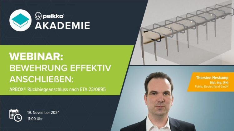 Entdecken Sie den ARBOX® Rückbiegeanschluss Der ARBOX® Rückbiegeanschluss wird eingesetzt, um Betonbauteile, die in verschiedenen Abschnitten betoniert werden, in effizienter Weise miteinander zu verbinden. Erfahren Sie in unserem kostenlosen Webinar am 19.11.2024 ab 11 Uhr, welche Vorteile Sie durch den Einsatz von ARBOX® erzielen können. Dipl.-Ing. (FH) Thorsten Heskamp, Customer Engineer bei Peikko Deutschland GmbH erläutert…Continue reading Bewehrung effektiv anschließen: ARBOX® Rückbiegeanschluss nach ETA 23/0895 (Webinar | Online)