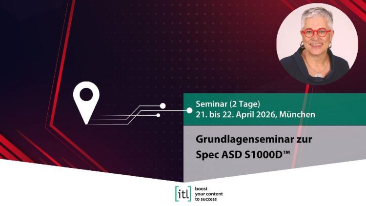 Grundlagenseminar zur Spec ASD S1000D™21. bis 22. April 2026, MünchenReferentin: Pia Grubitz Sie sind Technischer Redakteur und möchten zum ersten Mal Datenmodule gemäß S1000D™ bearbeiten? Sie möchten erfahren, welche Teile der S1000D™ – einer umfangreichen Spezifikation der ASD (früher: AECMA) über Beschaffung, Erstellung, Verteilung und Pflege von Technischer Dokumentation – für Sie wichtig sind? Sie…Continue reading Grundlagenseminar zur Spec ASD S1000D™ (Seminar | München)
