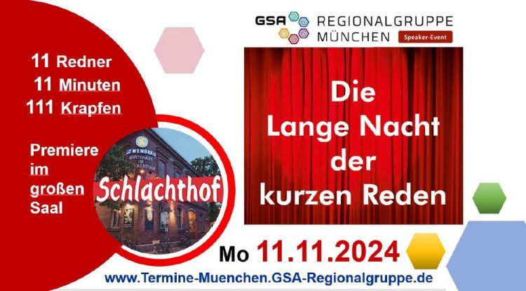 Nach den gelungenen Speaker-Events in den Jahren 2016, 2017, 2018 , 2019, 2021, 2022 und 2023 lädt die GSA-Regionalgruppe München am 11. November 2024 wieder zur „Langen Nacht der kurzen Reden“. 11 Speaker werden jeweils in 11 Minuten höchst unterschiedliche Themen vortragen. Auch in 2024 wird „Die Lange Nacht der kurzen Reden“ wieder im urig…Continue reading Die Lange Nacht der kurzen Reden – 11 Redner je 11 Minuten und 111 Krapfen (Workshop | München)