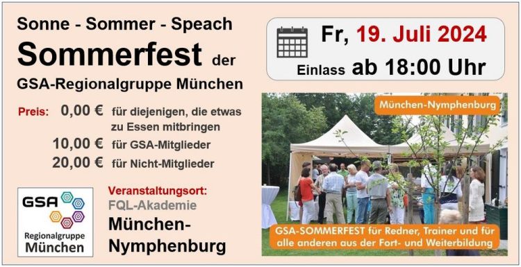 Das Sommerfest findet in einem Garten in München (Nymphenburg/Gern) statt. Es werden sowohl Stehtische als auch Bierbänke/Tische zur Verfügung stehen. Im Vordergrund des Sommerfest steht der ungezwungene Austausch untereinander. Jeder Gast kann/darf nicht nur seine/n Partner/in sondern auch etwas zu essen mitbringen (Salat, Salziges oder Süßes) … und kann dann kostenfrei beim Sommerfest dabei sein. Wer nichts mitbringt, zahlt…Continue reading Sonne – Sommer – Speach: Das Sommerfest der GSA-Regionalgruppe München (Workshop | München)